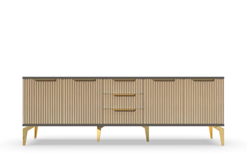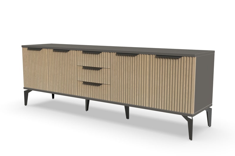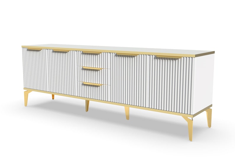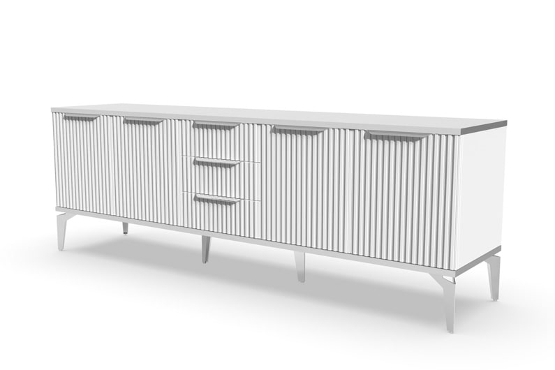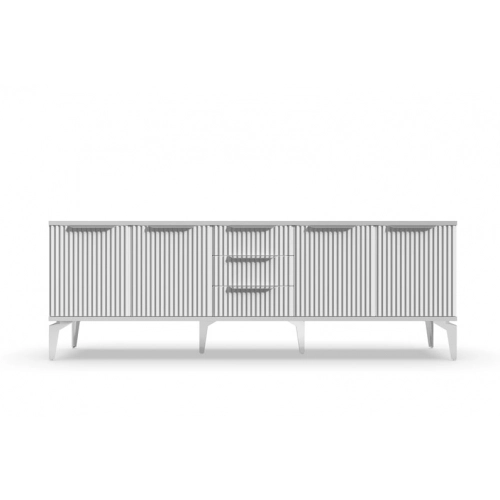 Тумба под телевизор "Рейн" является идеальным дополнением к любому современному интерьеру. Она имеет практичный дизайн, который позволяет хранить различные предметы и украшения, при этом оставаясь удобной и функциональной. Рифлёные поверхности придают тумбе уникальный и стильный вид, который будет выглядеть превосходно в вашей гостиной или гостевой комнате.